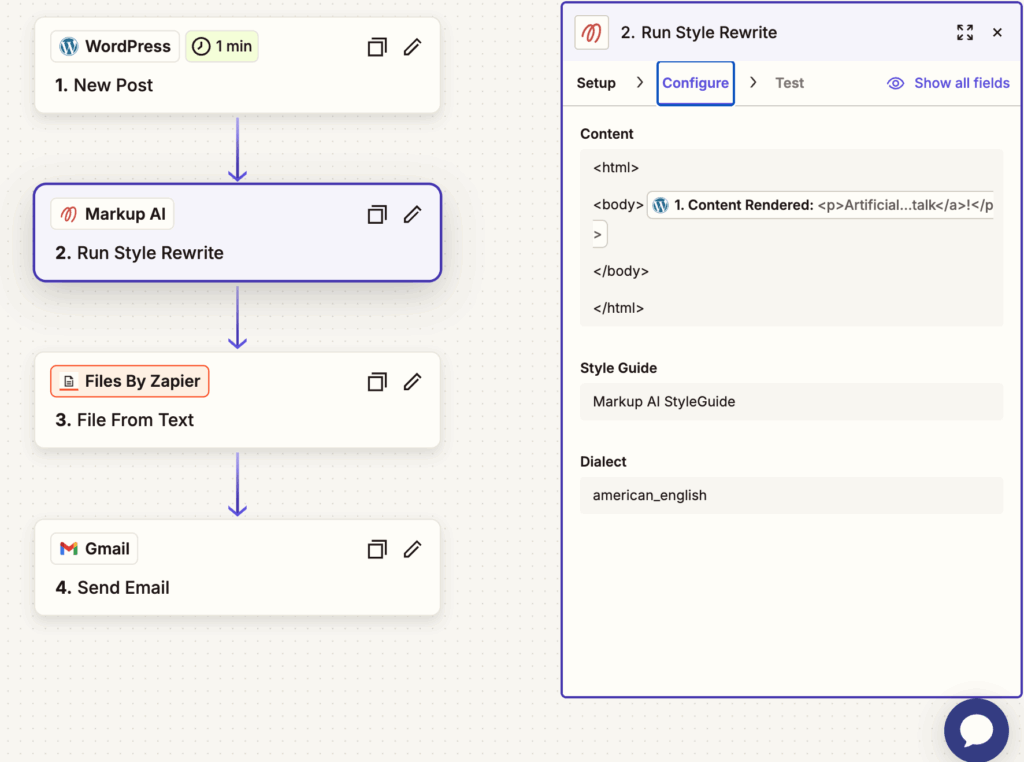 Step 2: Add a new step and add the “Markup AI” app. Under Setup/Event, choose “Run Style Rewrite.” And under Configure in the Content area, add opening and closing HTML and Body tags. And in between the body tag, insert a dynamic content field for “WordPress Content Rendered.” This will add the blog post to the request sent to Markup AI for checking.