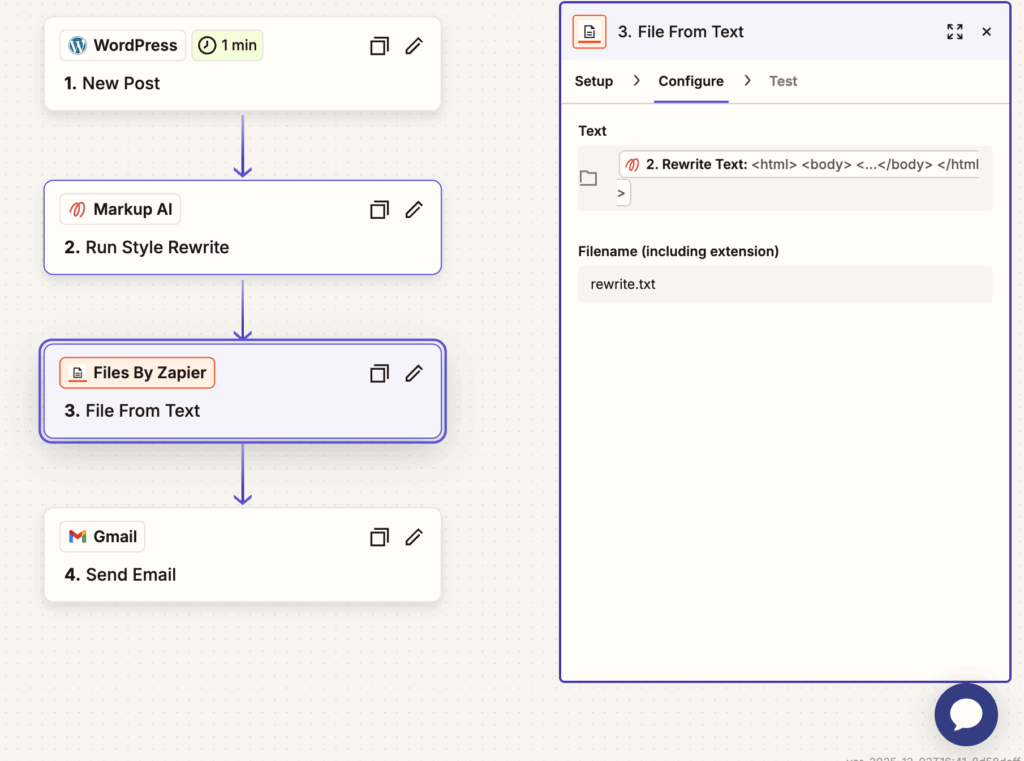 Step 3: Add a new step and use the “Files By Zapier” app. Under Setup choose the Action Event “File From Text.” Then under Configure, insert a dynamic content field for “Rewrite Text” from Markup AI. Add a filename such as “rewrite.txt.