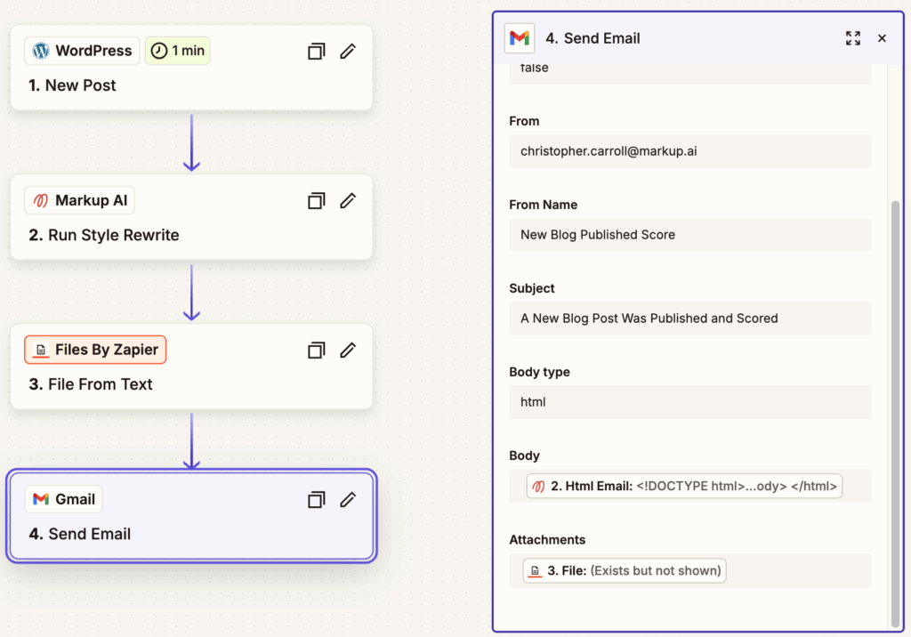 Step 4. Add a new step and use your preferred email provider. In this example we used “Gmail.” Set the Action Event to “Send Email.” Then complete the fields for “from, from name, subject, body type =HTML. Then under the body area, add the dynamic field of the Markup AI “HTML Email.” Under Attachments, add a dynamic field for the “Files By Zapier” and choose “File” to add the rewrite as an attachment to the email.